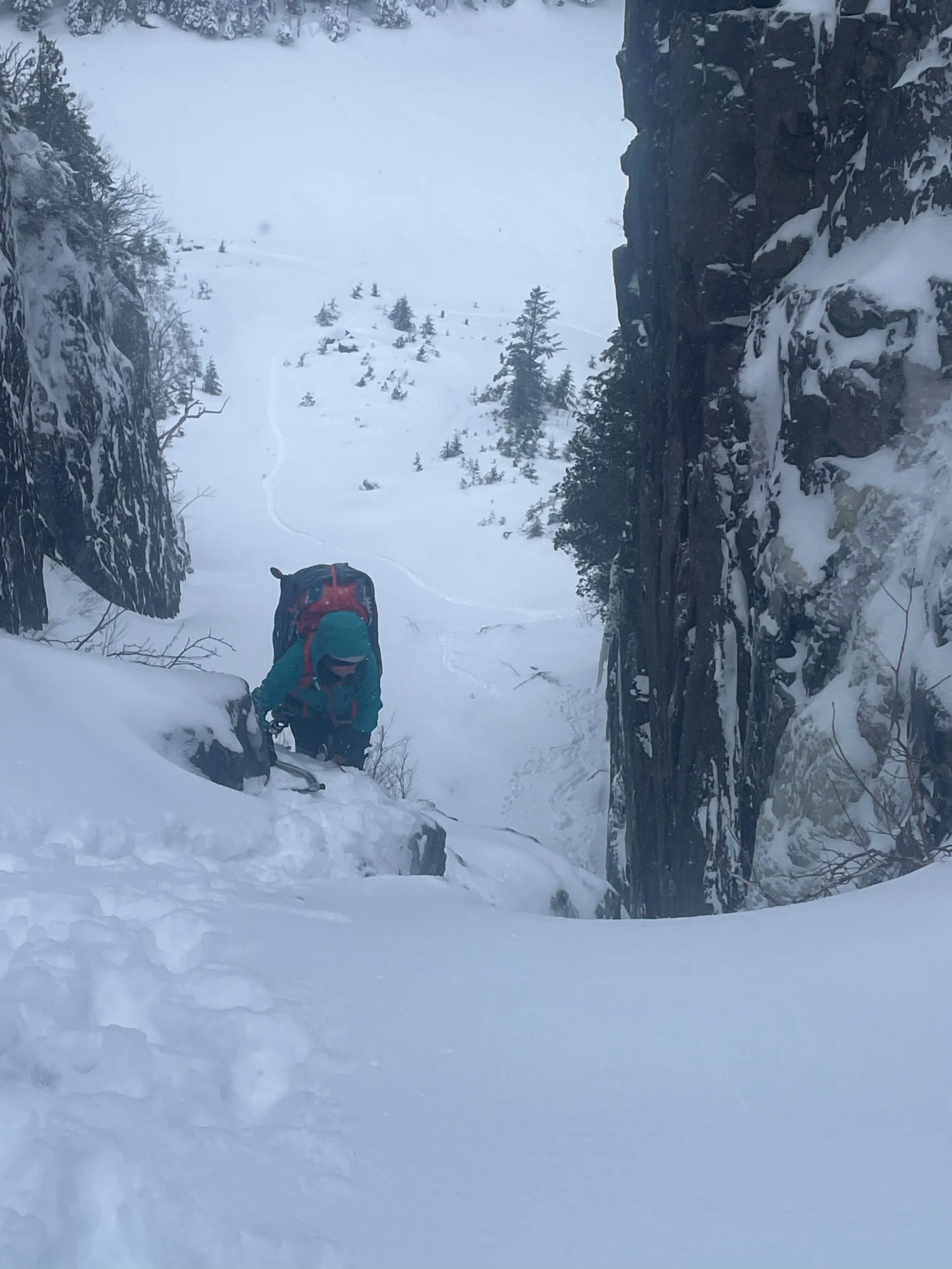 In these filled out conditions, there were several options for ice belays at the top of this section to belay a follower.